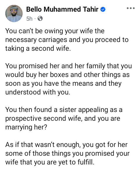 A Nigerian Muslim cleric, Bello Muhammed Tahir has addressed men who take second wives without fulfilling all the promises they made to their first wives. You cant be owing your wife the necessary carriages and you proceed to taking a second wife, he wrote in a Facebook post on Tuesday, September 24 You promised her and her family that you would buy her boxes and other things as soon as you have the means and they understood with you. You then found a sister appealing as a prospective second wife, and you are marrying her? As if that wasnt enough, you got for her some of those things you promised your wife that you are yet to fulfill. And when she talks now, we would be quick to label it jealousy or that she doesnt want a second wife. There are some of us who are not qualified to have a wife, let alone dualize. Allahumma barik. The post You cant be owing your wife the necessary carriages and proceed to take a second wife – Nigerian Muslim cleric tells men appeared first on Swordpress Blog .