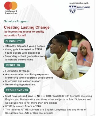 The Pan Atlantic University Mastercard Foundation Scholarship offers full tuition coverage, accommodation, and living expenses, mentorship and leadership development, as well as internship and career support.