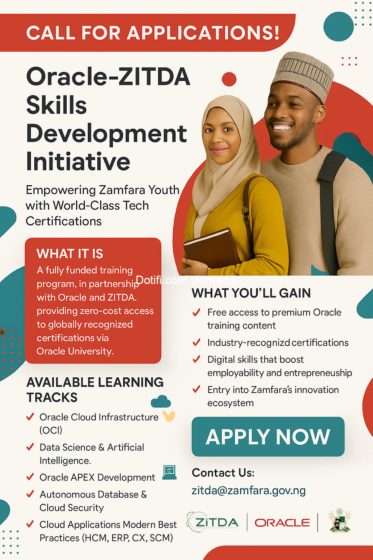 The Zamfara Information Technology Development Agency (ZITDA), in partnership with Oracle Corporation, invites interested and qualified youth to apply for the Oracle-ZITDA Skills Development Initiative (SDI) – a transformative program aimed at building a digitally skilled workforce in Zamfara State.