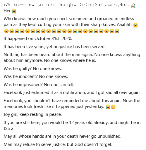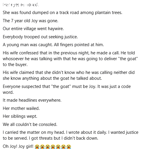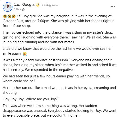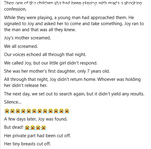 A Nigerian man, Sam Odeg, has recalled the gruesome m8rder of his neighbour’s seven-year-old daughter, Joy, by suspected ritualists five years ago. Taking to Facebook on Saturday, November1, 2025, Odeg narrated how Joy was found d3ad with her private parts and eyes removed a few days after she went missing. According to Odeg, the tragic incident began on October 31, 2025 when the minor suddenly disappeared while playing with her mates outside his shop. The community launched a search party but all efforts to find her proved abortive. One of the children claimed that a young man had approached them and asked Joy to come and take something. Joy went to the man and that was the last time she was seen alive. Odeg said a suspect was later arrested in connection with the gruesome m8rder but nothing has been heard about the case since then, alleging a cover-up. It has been five years, yet no justice has been served. Kai! Joy girl! She was my neighbour. It was in the evening of October 31st, around 7:00pm. She was playing with her friends right in front of our shop, he wrote. Their voices echoed into the distance. I was sitting in my sister’s shop, gisting and laughing with everyone there. I saw her. We all did. She was laughing and running around with her mates. Little did we know that would be the last time we would ever see her smile again. It was already a few minutes past 9:00pm. Everyone was closing their shops, including my sister, when Joy’s mother walked in and asked if we had seen Joy. We responded in the negative. We had seen her just a few hours earlier playing with her friends, so where could she be?Her mother ran out like a mad woman, tears in her eyes, screaming and shouting, Joy! Joy! Joy! Where are you, Joy? That was when we knew something was wrong. Her sudden disappearance was unusual. Everybody started looking for Joy. We went to every possible place, but we couldn’t find her. Then one of the children she had been playing with made a shocking confession. While they were playing, a young man had approached them. He signaled to Joy and asked her to come and take something. Joy ran to the man and that was all they knew.Joy’s mother screamed. We all screamed. Our voices echoed all through that night. We called Joy, but our little girl didn’t respond. She was her mother’s first daughter, only 7 years old. All through that night, Joy didn’t return home. Whoever was holding her didn’t release her. The next day, we set out to search again, but it didn’t yield any results. Silence A few days later, Joy was found. But dead! Her private part had been cut off. Her tiny breasts cut off. Her eyes removed. She was found dumped on a track road among plantain trees. The 7 year old Joy was gone. Our entire village went haywire. Everybody trooped out seeking justice. A young man was caught. All fingers pointed at him. His wife confessed that in the previous night, he made a call. He told whosoever he was talking with that he was going to deliver “the goat” to the buyer. His wife claimed that she didn’t know who he was calling neither did she know anything about the goat he talked about. Everyone suspected that “the goat” must be Joy. It was just a code word.It made headlines everywhere. Her mother wailed. Her siblings wept. We all couldn’t be consoled. I carried the matter on my head. I wrote about it daily. I wanted justice to be served. I got threats but I didn’t back down.Oh Joy! Joy girl! Who knows what you went through in the hands of your captors. Hei Who knows how much you cried, screamed and groaned in endless pain as they kept cutting your skin with their sharp knives. Aaahhh It happened on October 31st, 2020. It has been five years, yet no justice has been served. Nothing has been heard about the man again. No one knows anything about him anymore. No one knows where he is.Was he guilty? No one knows. Was he innocent? No one knows. Was he imprisoned? No one can tell. Facebook just exhumed it as a notification, and I got sad all over again. Facebook, you shouldn’t have reminded me about this again. Now, the memories look fresh like it happened just yesterday. Joy girl, keep resting in peace. If you are still here, you would be 12 years old already, and might be in JSS 2. May all whose hands are in your d3ath never go unpunished. Man may refuse to serve justice, but God doesn’t forget. He rewards every man accordingly, no matter how long it takes.