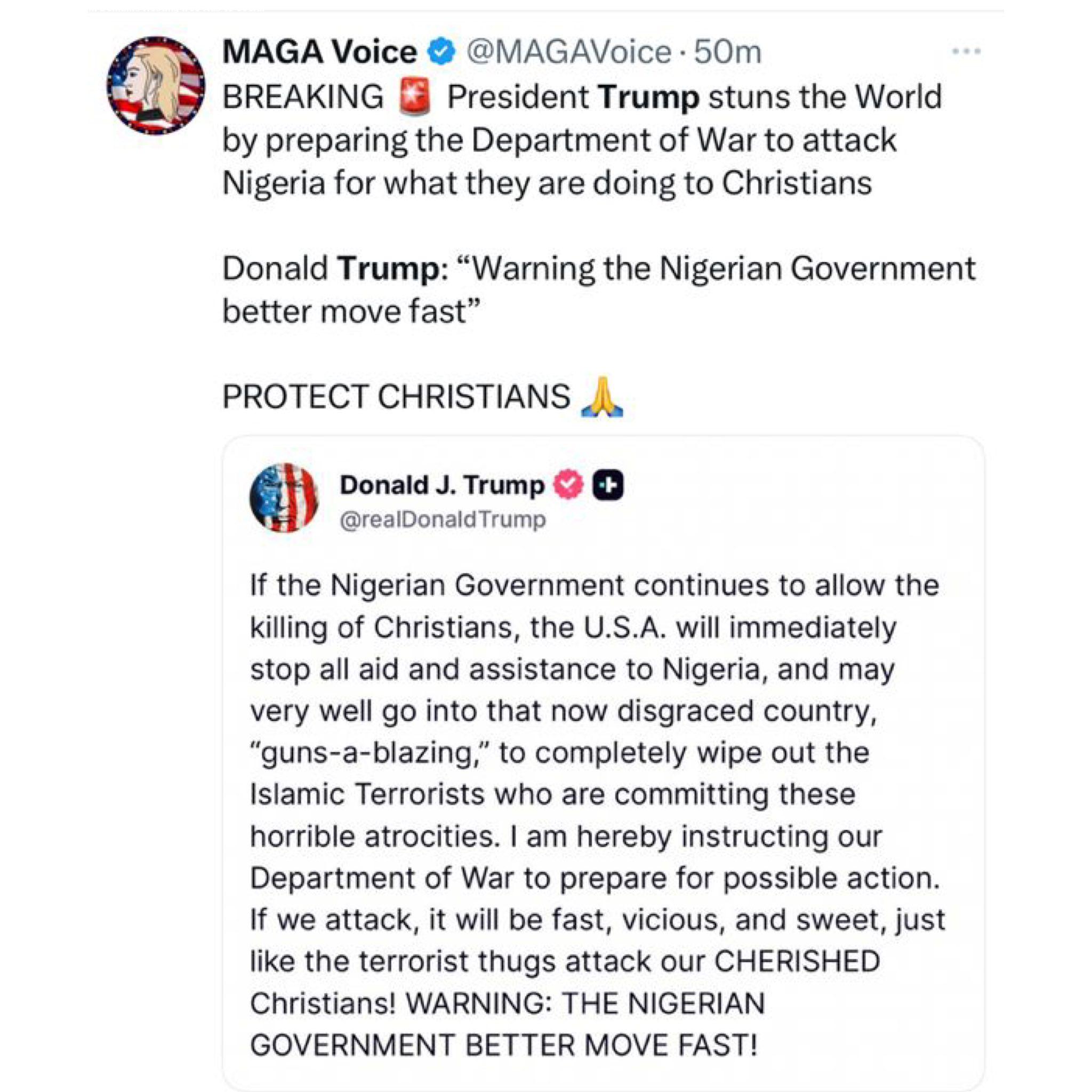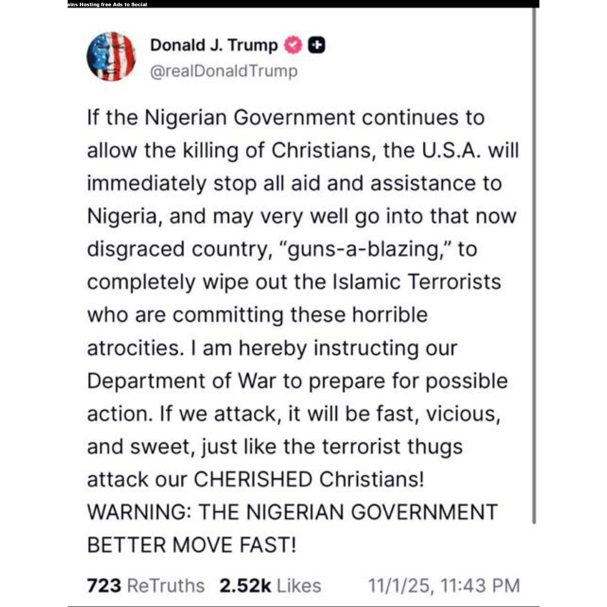 US President Donald Trump has threatened to take military action against Nigeria if the government fails to stop the ongoing killings of Christians in the country. In a fiery post on social media, Trump warned that the United States would halt all aid and assistance to Nigeria and could launch direct intervention if attacks on Christians persist. If the Nigerian Government continues to allow the killing of Christians, the U.S.A. will immediately stop all aid and assistance to Nigeria, and may very well go into that now disgraced country, guns-a-blazing, to completely wipe out the Islamic terrorists who are committing these horrible atrocities, Trump said. I am hereby instructing our Department of War to prepare for possible action. If we attack, it will be fast, vicious, and sweet, just like the terrorist thugs attack our cherished Christians! WARNING: THE NIGERIAN GOVERNMENT BETTER MOVE FAST! The statement follows Trumps recent decision to designate Nigeria as a country of particular concern under the International Religious Freedom Act, citing what he described as severe violations of religious freedom. Nigeria has faced a wave of violence and insecurity in recent years, including attacks by Boko Haram and other Islamist militant groups in the northeast, as well as deadly clashes between Fulani herdsmen and Christian farming communities. Trumps remarks have drawn mixed reactions globally. Supporters, including US Senator Ted Cruz and rapper Nicki Minaj, praised him for defending persecuted Christians. However, Nigerian officials have strongly rejected Trumps characterization of the situation. Yusuf Maitama Tuggar, Nigerias Minister of Foreign Affairs, told Newsweek there is no evidence of a Christian genocide, saying: There is no genocide, now or ever, in Nigeria. These claims are exaggerated and politically motivated. President Bola Ahmed Tinubu also responded, stressing that religious freedom and tolerance are core tenets of Nigerias identity. Nigeria opposes religious persecution and does not encourage it. Our population is nearly evenly split between Christians and Muslims, and our constitution guarantees freedom of religion, Tinubu said. The Trump administrations stance marks a sharp escalation in rhetoric toward one of Africas most populous nations and a key US ally in counterterrorism efforts. Observers warn that Trumps comments could heighten diplomatic tensions between Washington and Abuja as both nations navigate issues of religious freedom, security, and human rights.The post US President Donald Trump threatens military action should k!lling of Christians continue in Nigeria appeared first on Linda Ikeji Blog.
