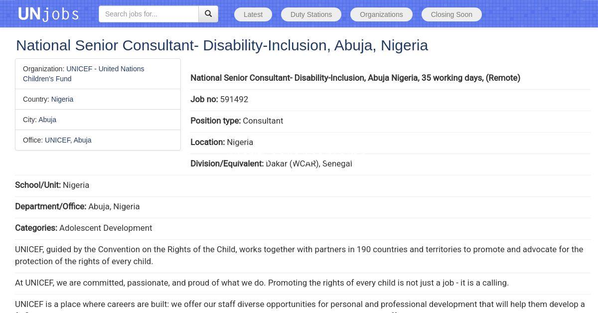 The post National Senior Consultant- Disability-Inclusion at UNICEF appeared first on Advert By Dotifi .Com Domains for almajiri.com.ng | Best African Hausa Music Blog, Entertainment ,News and Gossips .