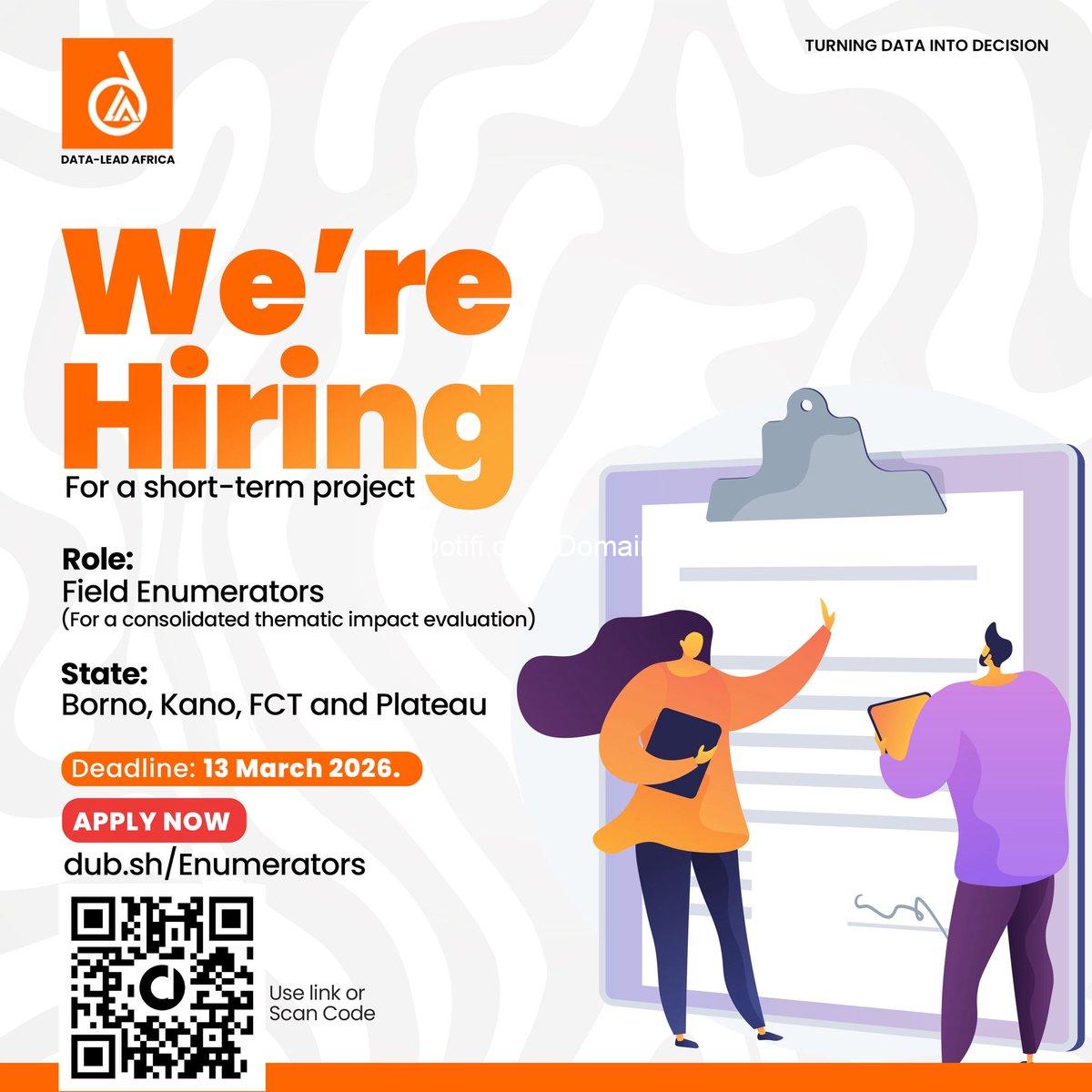 Data-Lead Africa is hiring Field Enumerators for a short-term consolidated thematic impact evaluation across Borno, Kano, FCT, and Plateau states. This project aims to assess program outcomes and support data-driven decision-making across these regions.