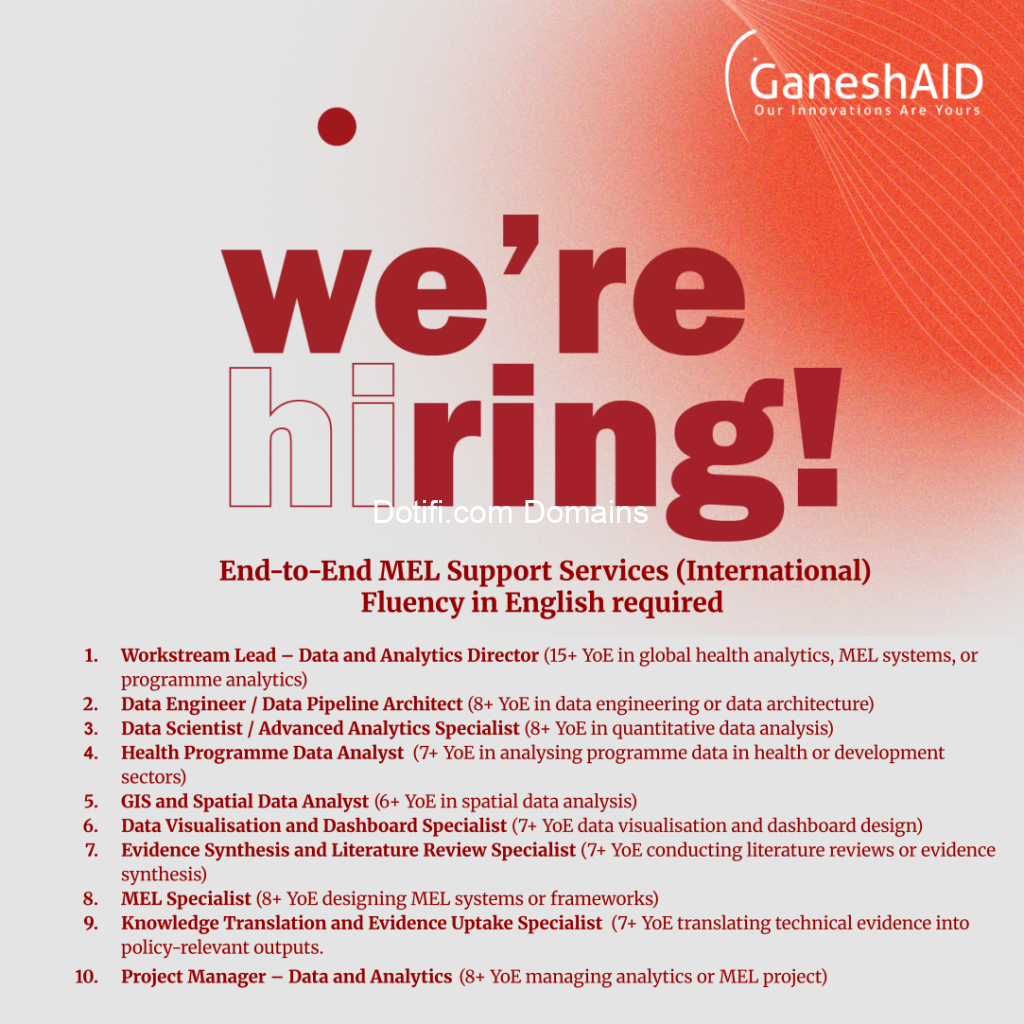 The post Recruitment of Experts for End-to-End MEL Support Services Vacancies Jobs at GaneshAID – Remote appeared first on Advert By Dotifi .Com Domains for almajiri.com.ng | Best African Hausa Music Blog, Entertainment ,News and Gossips .
