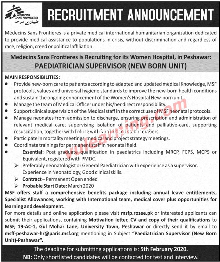 • Only short-listed candidates will be notified and invited for interview; MSF Belgium takes this opportunity to thank all potential candidates for their application.